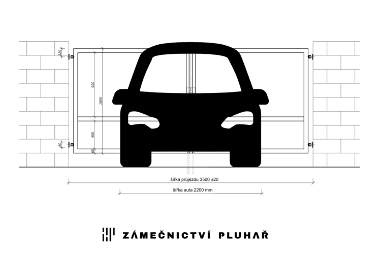 Dvoukřídlou vjezdovou branou š. 350 cm × v. 150 cm pohodlně projedete s každým běžným automobilem.