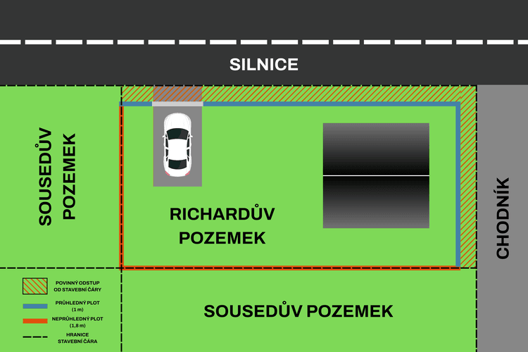Se sousedy se Richard rychle dohodl, že nový neprůhledný plot o výšce 1,8 metru povede přesně po hranici. Podepsali písemný souhlas s tím, že se o oplocení bude každý starat rovným dílem. Protože výška plotu nepřesáhne dva metry, obejdou se bez stavebního povolení.